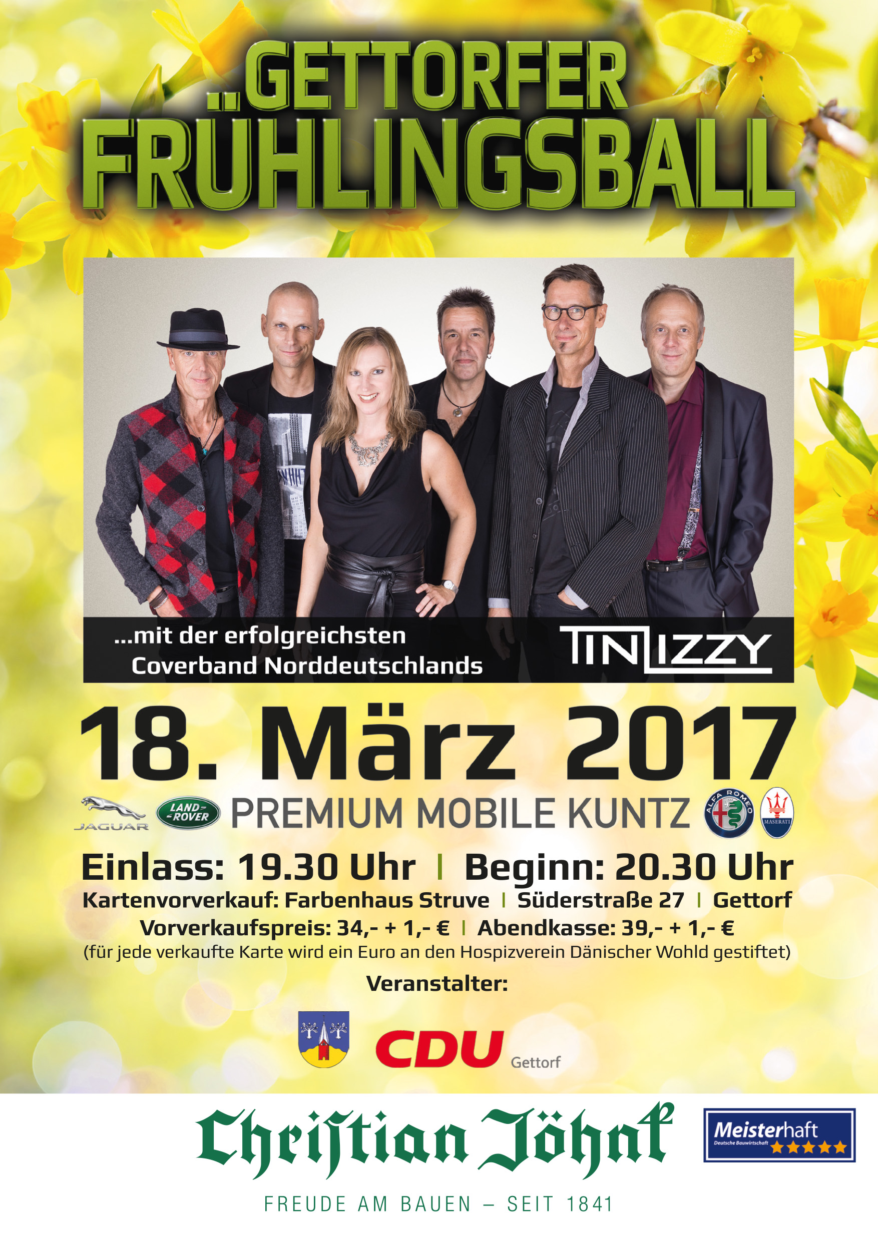 Bereits zum achten Male findet der Frühlingsball der Gettorfer CDU im Gewerbegebiet Eichkoppel, Eichkoppel 1, 24214 Gettorf, statt. Und erneut mit neuer Adresse, dabei bleibt alles am selben Ort. Jaguar Land Rover House Kuntz ist nur inzwischen "umgetauft". Das Autohaus am Rande des Orts heißt jetzt kürzer und knapper und einprägsamer:  "Premium Mobile Kuntz". Der Veranstaltungsort steht also erneut für die große Frühlingssause und auch die CoverBand TinLizzy ist verpflichtet. Fehlen nur noch die Gäste. Und die können ab dem 07. Januar 2017, 09.00Uhr, in der bewährten Vorverkaufsstelle Farbenhaus Struve, Süderstr. 27, in Gettorf, die Eintrittskarten erwerben.